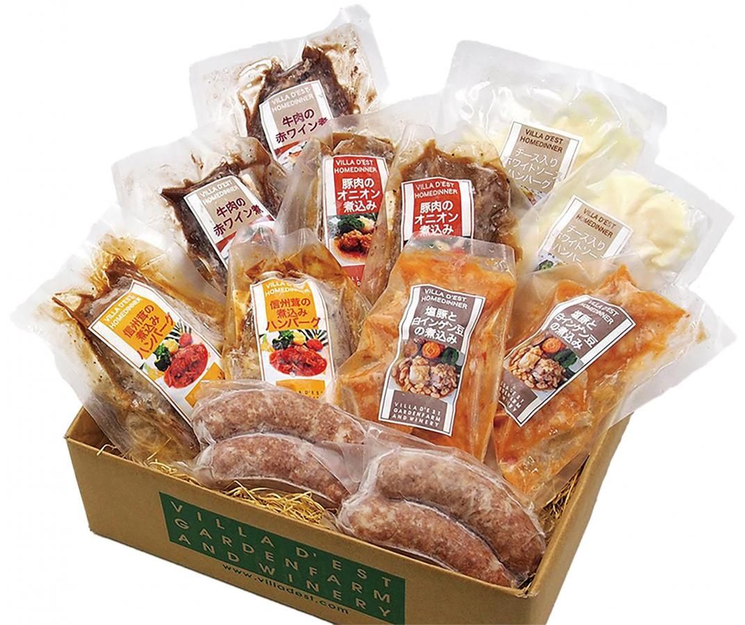 バラエティグルメセット 商品コード:19-20038 ヴィラデストカフェの人気メニューを存分に味わえる、ボリューム満点で豪華な詰め合わせです。 ●セット内容: 和牛の赤ワイン煮×2個、豚肉のオニオン煮込み×2個、信州茸の煮込みハンバーグ×2個、チーズ入りホワイトソースハンバーグ×2個、塩豚と白インゲン豆の煮込み×2個、手作りソーセージ(プレーン、黒胡椒)各2本 *写真2枚目以降は盛り付け例 発送方法 12,400円(税込)12,400円(税込) 購入数 ギフト包装やショッピングバックをご希望の方はこちらへ 同じカテゴリの商品